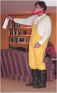 The only thing Pedro remembers from the Post Office letter is to safely dispose of suspicious letters. Here after using the powdered sugar in the letter he dons his HazMat suit to dispose of the envelope. |