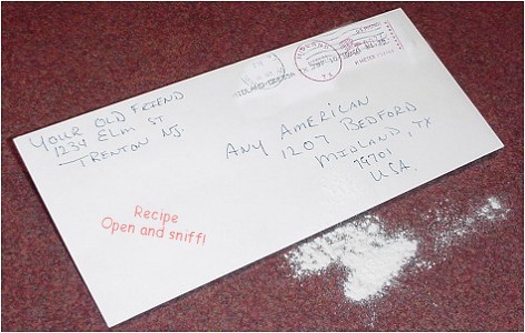 Pedro receives a suspicious letter Saturday. He also remembers getting something from the Post Office about Amtrax, but since he doesn't travel by train, he disregarded most of it. Pedro didn't know that he had an old friend in Trenton N.J., but when he opened the letter and what he thought was powdered sugar fell on the counter, he knew that this was probably a 'recipe chain-letter'. The note inside said simply, "9-11". This he reasoned was the number of cookies that the recipe would make. Actually the 'powdered sugar' that came with the recipe made far fewer, possibly because he wasted some when he sneezed and some of the 'sugar' flew into the air. And....the cookies had an odd flavor.