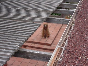 Tres awaits nervously, ready to drag Pedro to safety should he be blown off of the roof in a blinding 24 million volt explosion. He is well trained since the hedge trimming electrical incident. |