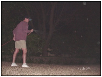 In anticipation of Hollywood personalities visiting soon...Pedro works from "Can" to "Cain't" cleaning up the yard. With all the old used tires gone Pedro hoses down the toxic site where the car batteries were stored. Next, remove the HerculonŠ recliner from the herb garden!