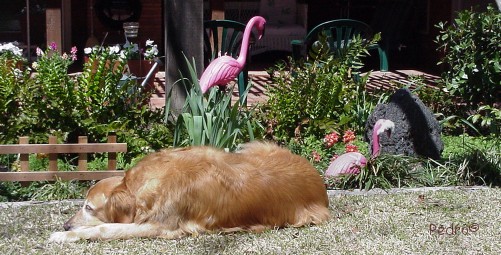 Resting comfortably on it's nest after yesterday's savage and vicious attack by nurse Moore, the yet unnamed Flamingo is doing as well as can be expected. Though not use to treating plastic flamingoes, Vetinarian and friend Dr. Greg Adkins patched the beak and wing of bird #1 and thinks a full recovery is in order. The bird has not been able to stand since the attack as it's stick legs are rather wobbly. Having come to love his avian charges, Tres the Big Gold Dog, is on sentinel, ready to spring on the nurse should she appear thru the gate! |