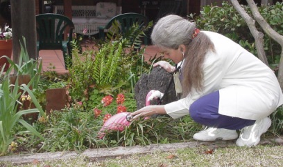 Nurse Moore, having calmed down after her "episode," has great feelings of remorse about her violent actions towards the flamingoes. Basically a kind person at heart [and fearing a lawsuit] she uses her medical skills as a former Army nurse, and a modicum of compassion learned as a flight attendant to check on Bird #1's status. Here, stethoscope in hand she checks for signs of permanent damage. "Fit as a Flamingo Fiddle" is the pronouncement, though Pedro will also seek a second opinion. |