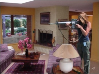 Sharon gets carried away and is about to burn a 20 round magazine of .223 ball ammo into Pedro's bookshelf containing her husband's book. "Turn it around so I can see his face on the back cover", she quips laughingly[?] |